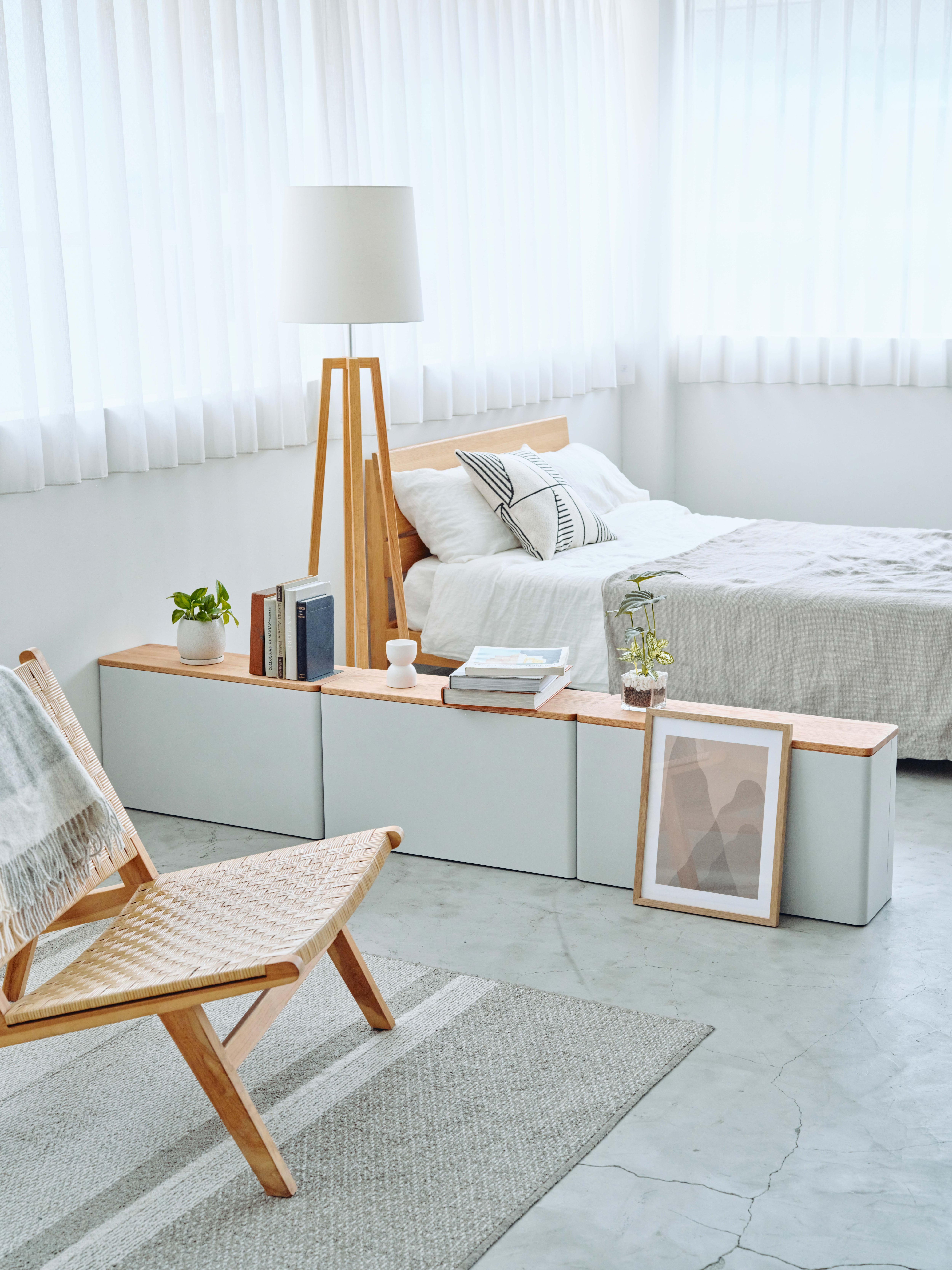 日本の住まいの空間に調和するようオーク材を天板に使用し、正面の角は丸みをもたせ柔らかな印象に仕上げました。複数組み合わせて壁に沿わせ棚のように設置することもできます。