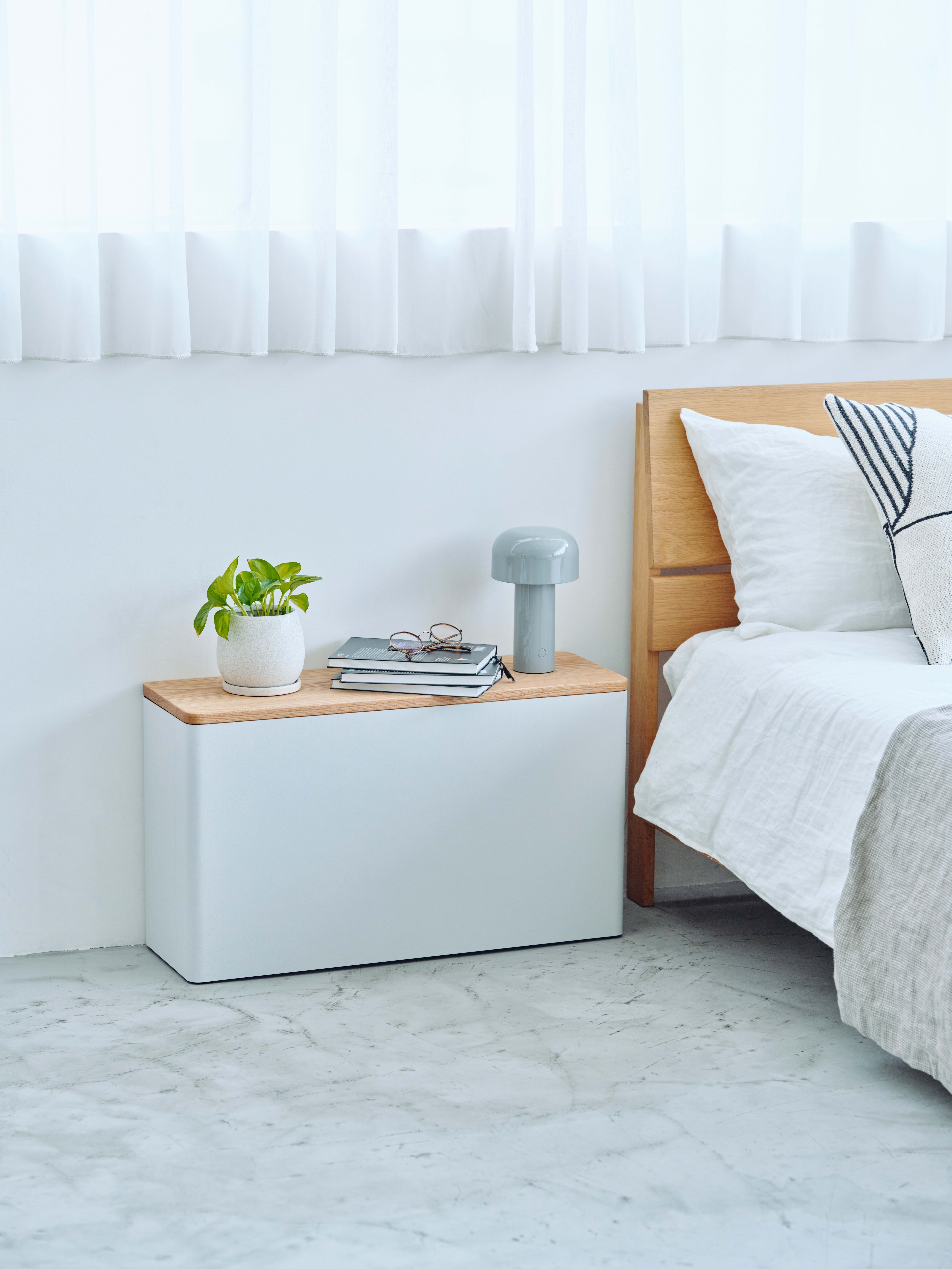 2人分の備蓄品がすっきりと収まるサイズです。本体のスチール部分は、艶を抑えたマットな質感が特徴です。日本の住まいの空間に調和するようオーク材を天板に使用し、正面の角は丸みをもたせ柔らかな印象に仕上げました。複数組み合わせて壁に沿わせ棚のように設置することもできます。