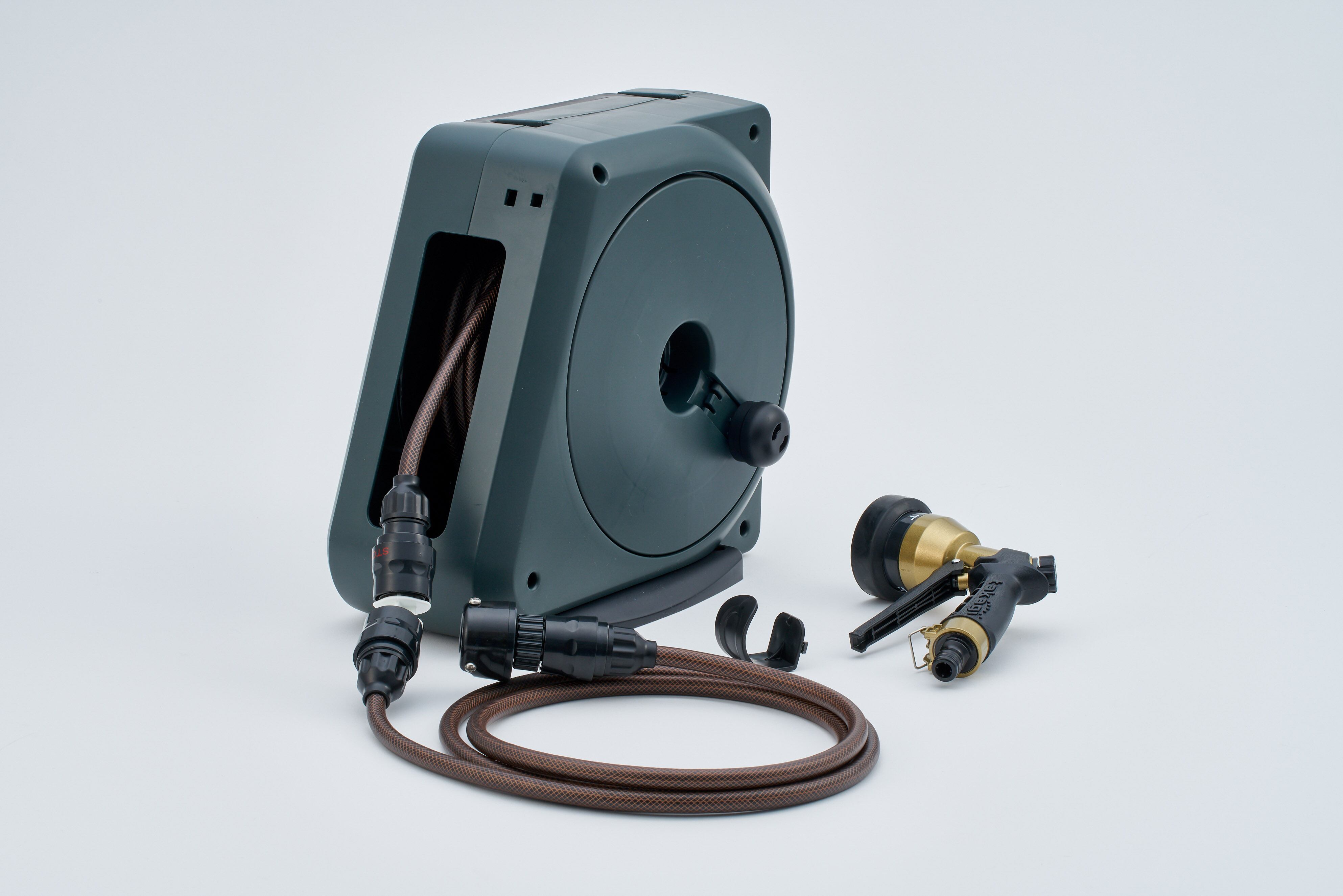 ホースは本体カバーに収納されるため、手を汚さずにホースをきれいに巻きとれ、 日差しによる劣化からホースを守ります。