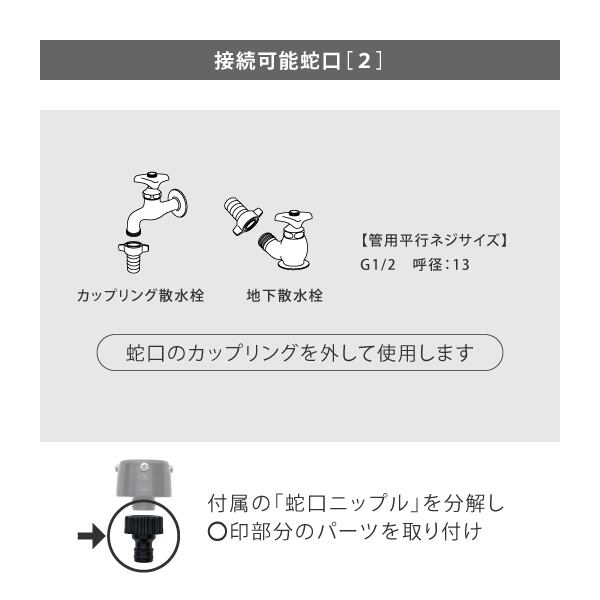 屋外にある蛇口であればほとんど取り付けることができます。お買い求めの際は、使用する場所の蛇口形状を事前にご確認ください。