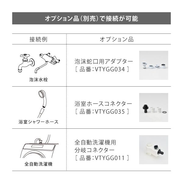 水道側ホース(2m)、蛇口への接続コネクター、ノズル、ノズルフックが標準付属しています。