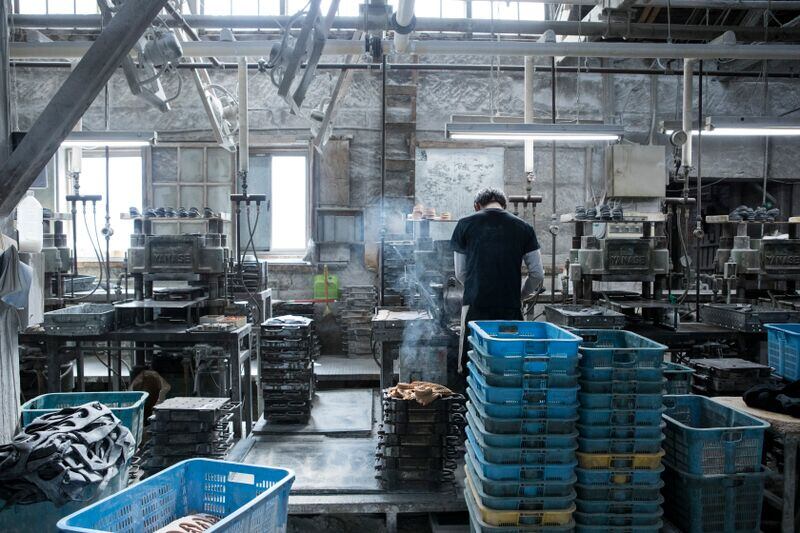 本製品は、品質を確保するため北海道小樽市にある自社工場にて職人が1足ずつ手作りしています。ゴムを伸ばし、型を抜き、貼り合わせて、窯で焼く。一足ずつ手作業でつくる長靴の製法は、80年以上前から変わりません。