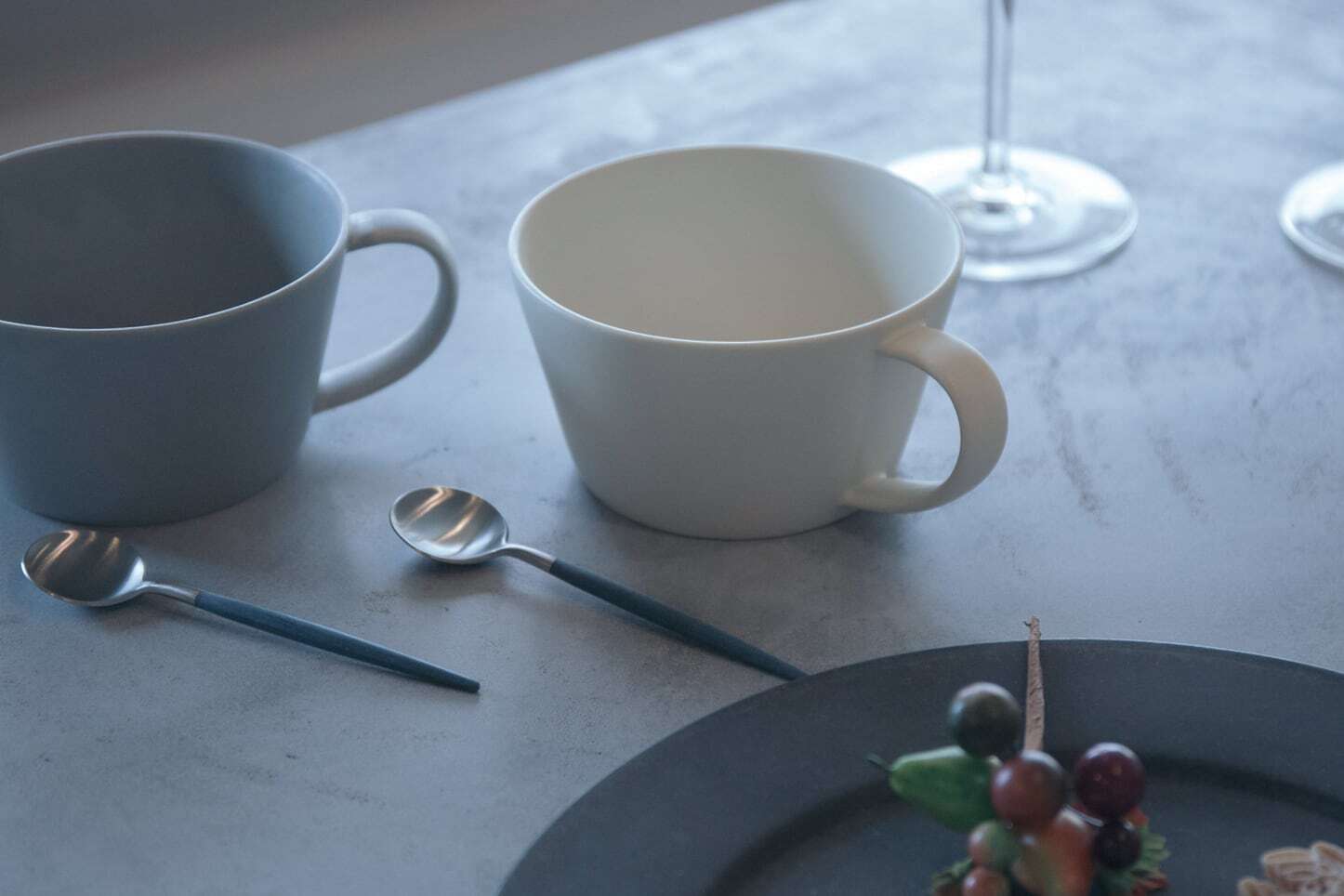 テーブルになじみ、他の食器とも合わせやすい「グレー」と「クリーム」の2色セットです。コーヒーカップよりも大きく(約350ml)で、スープをたっぷりと注いでいただけます。カフェオレボウルやヨーグルトを入れるカップとしてなど、多用途に使える存在感のあるサイズです。